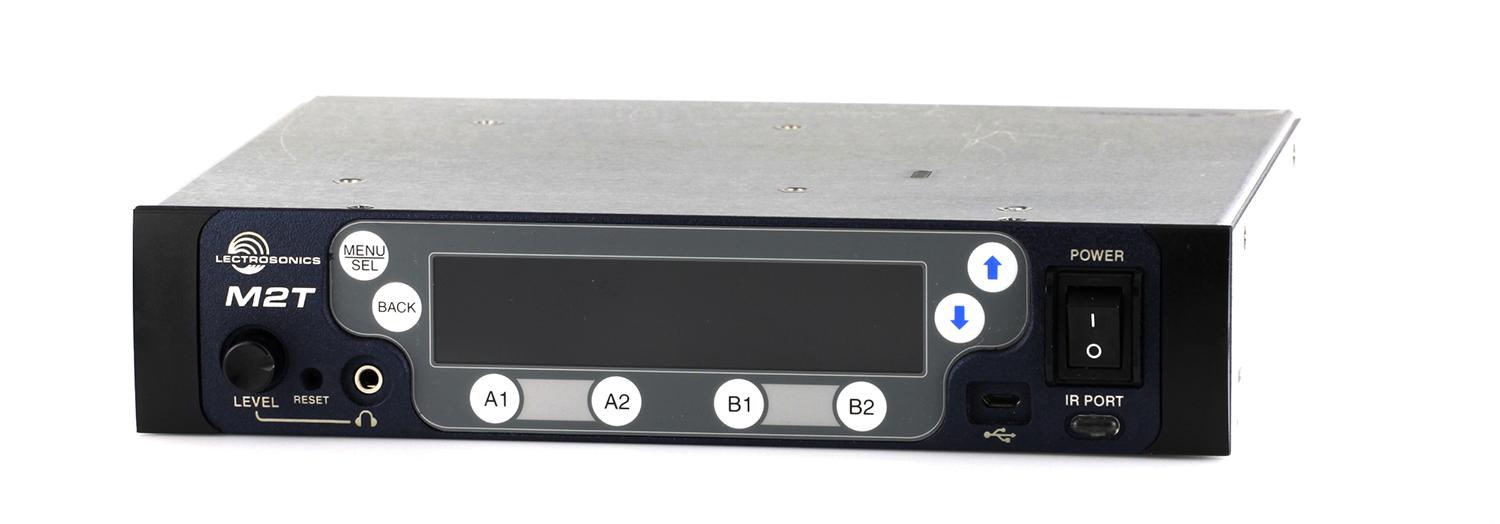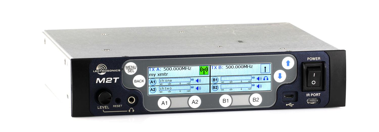 Built with a USB port for firmware updates and an IR port for fast setups, the M2T transmitter has a large, high-resolution backlit color LCD with large membrane switches for an intuitive interface visible in daylight or dimly-lit conditions. Analog signals are converted to an internal 24-bit digital format that is encoded, organized into packets, and passed to an RF modulator. The RF signal is filtered before and after amplification to suppress out-of-band noise and spurious signals.